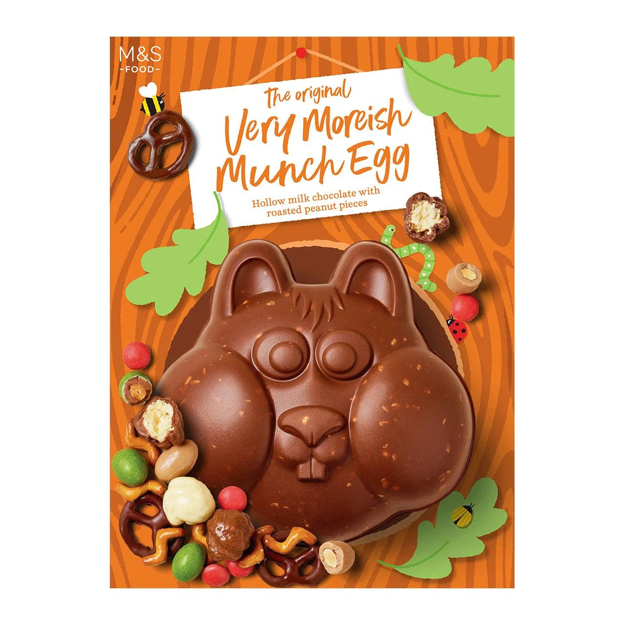 A hollow milk chocolate shape with roasted peanuts and a bag of milk and white chocolate coated popcorn, salted pretzels, sugar coated milk chocolate, sugar coated milk chocolate peanuts, almonds in a salted caramel flavour coating and dark chocolate coated salted pretzels.
