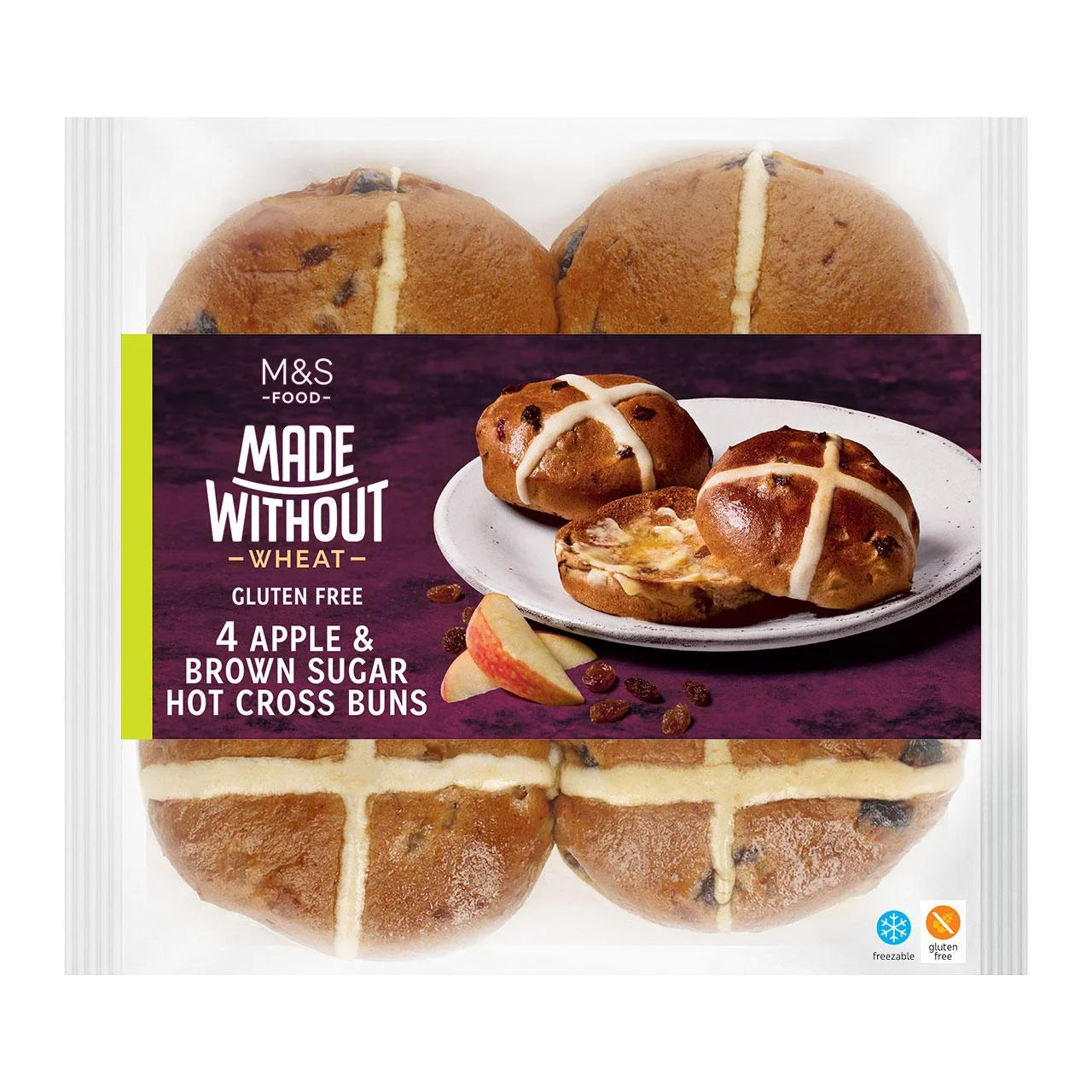 Made Without Wheat Gluten Free 4 Apple & Brown Sugar Hot Cross Buns. Packed Full of Juicy Fruit Soaked in Orange Juice, Candied Apple and a Unique Spice Blend, Suitable for vegetarians