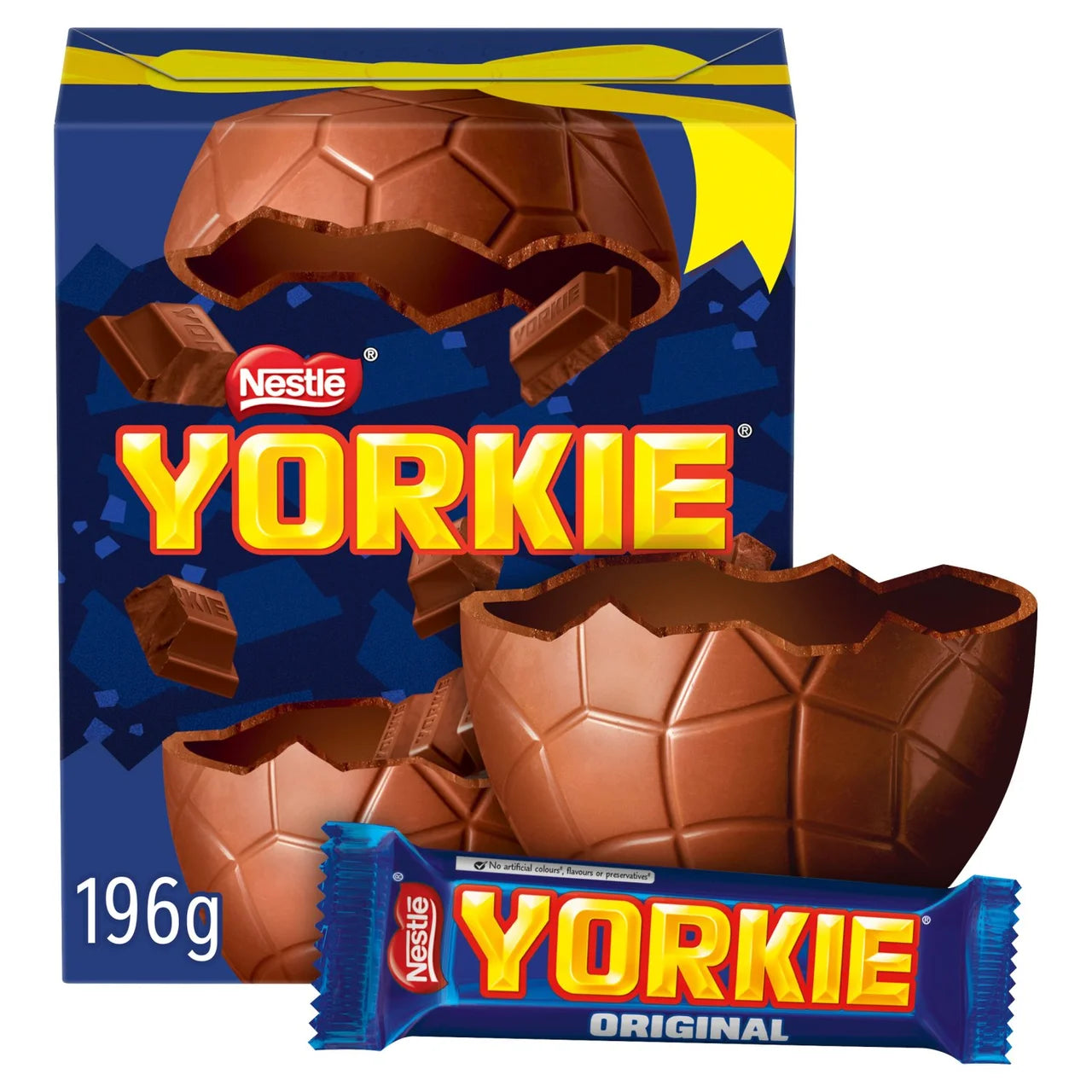 196g Yorkie® milk chocolate Easter Egg with a full size milk chocolate Yorkie® Bar.